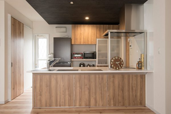 キッチン上部は下がり天井でデザイン性をアップ