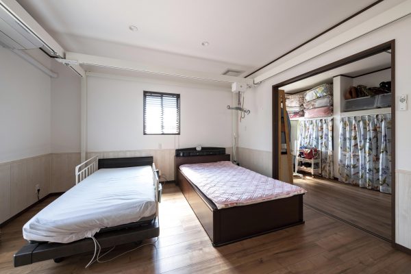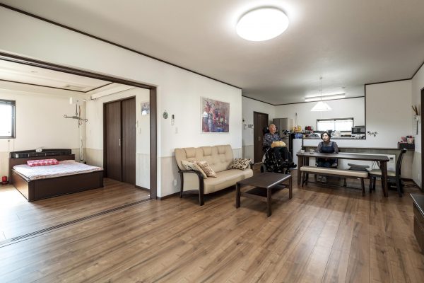 リビングを中心に寝室や水まわりを配置、車イスでも動きやすいように間口は大きく